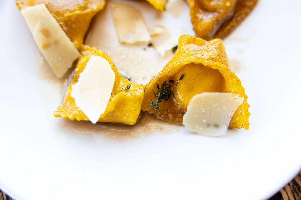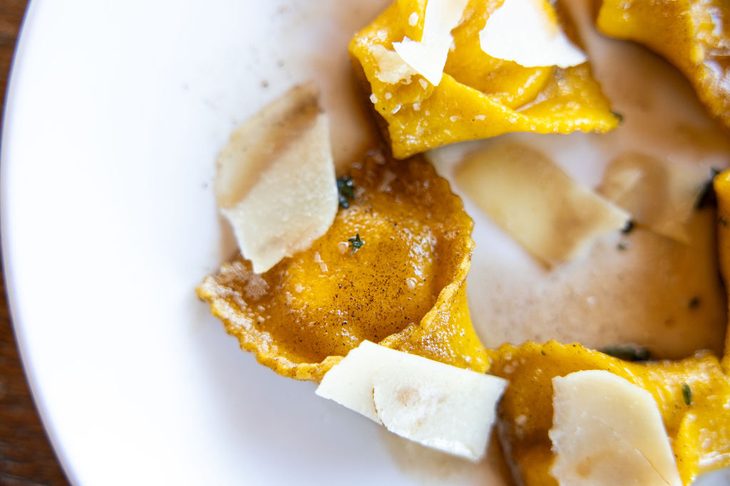 House-made egg pasta hand stuffed with our own cured and smoked bacon lardons, bechamel, and parmesan cooked and topped with brown butter sauce, and thyme.