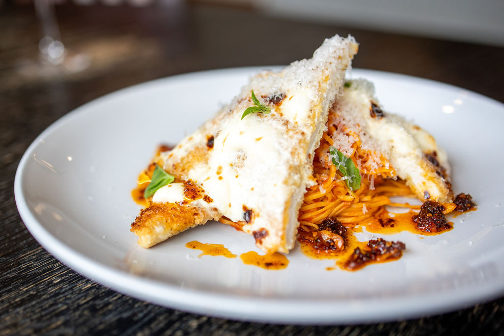 Cast iron fried breaded chicken breast served on a bed of house-made fettuccini in arabiata, and topped with sauce mornay, fresh shredded mozzarella, and chili crisp oil.