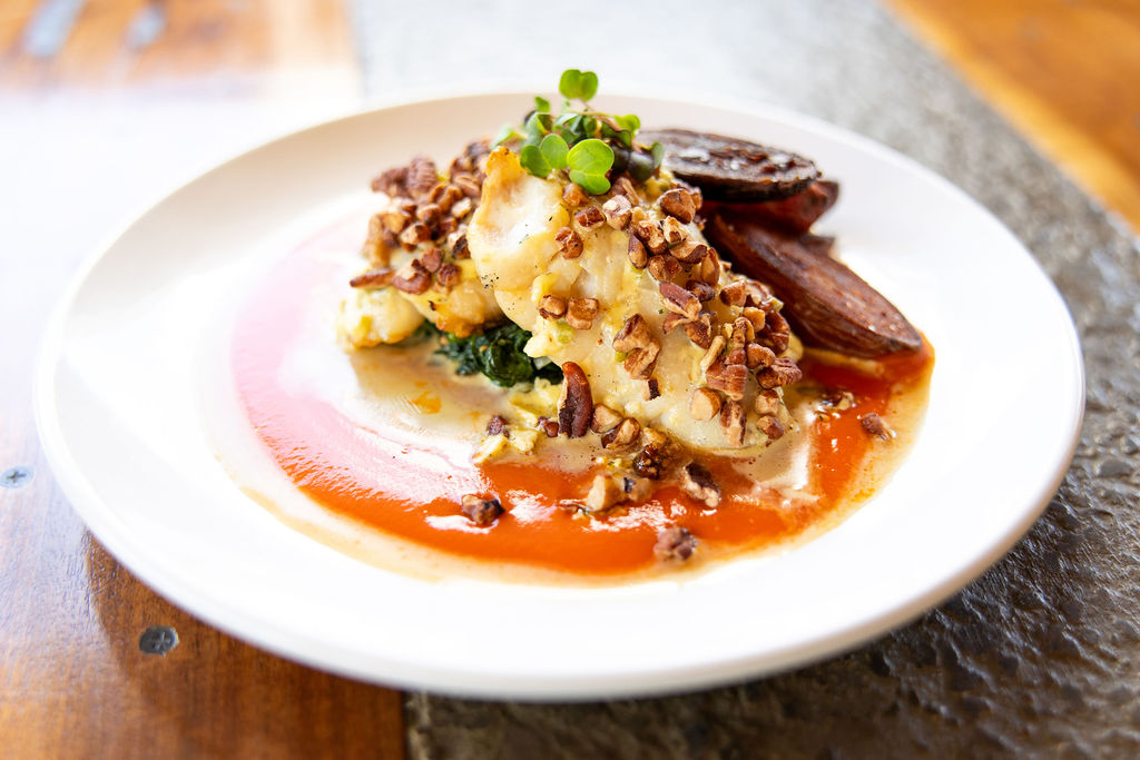 Pecan crusted grilled wild caught tilefish over a red pepper coulis with bourbon mustard cream spinach, and a house-made tartar sauce.